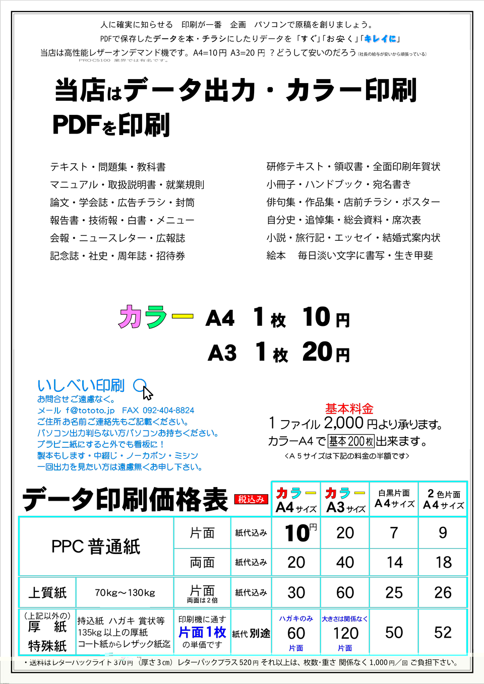 A4 1枚10円A3 1枚20円